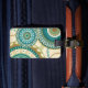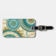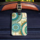 © Veronique Charron / Wild Apple. This image of circular patterns feature blue and gold colours. The image has a tan coloured, floral patterned background.