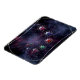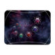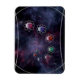 An illustration of infinity, crossing the universe to combine the microscopic and the telescopic in a rainbow display of shapes and colours. A column of multi-coloured atoms of blue, pink, red, and green circled by silver rings, spiralling across outer space against a backdrop of colourful fractal galaxies.