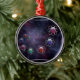 An illustration of infinity, crossing the universe to combine the microscopic and the telescopic in a rainbow display of shapes and colours. A column of multi-coloured atoms of blue, pink, red, and green circled by silver rings, spiralling across outer space against a backdrop of colourful fractal galaxies.