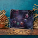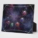 An illustration of infinity, crossing the universe to combine the microscopic and the telescopic in a rainbow display of shapes and colours. A column of multi-coloured atoms of blue, pink, red, and green circled by silver rings, spiralling across outer space against a backdrop of colourful fractal galaxies.