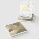 The coasters are gorgeous, a quality feel and heavy weight. They look like a precious archeological find. A rustic stone juxtaposed with a modern floral black and white print. I like the way the print goes slightly imperfect on the cut stone edges giving them a kind-of natural beauty.
