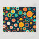 A vibrant and playful pattern composed of overlapping circles in various sizes and colours. The circles are arranged in a seemingly random yet harmonious manner, creating a dynamic and visually interesting composition. The colour palette includes shades of orange, blue, yellow, and red, set against a dark background. The overall effect is both energetic and cheerful.