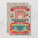 Super cute, rustic "under the big top" circus or carnival birthday party. Acrobats ride horses, big striped tent, banners and a VIP ticket to the birthday party against a wood panelled background. The back is decorated with a elephant balancing on a ball. Hand drawn illustration by McBooboo.
