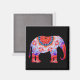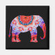 This square magnet is printed with a colourful kaleidoscope elephant in blue, orange, and lavender with a black background.