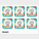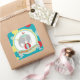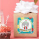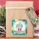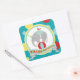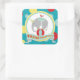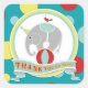 Fun circus theme sticker with bright polka dots and an elephant with birthday hat balancing on a ball and a red bird with birthday hat.