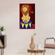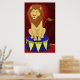 A poster print featuring an illustration of a circus lion sitting on a blue and yellow podium. There's a spotlight shining on him, and a beautiful red curtain with gold trim is behind him. This cartoon circus lion poster would make a great gift for kids, big cat lovers, and people who love the circus.