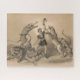 Vintage print of a male circus performer standing among a lion, a tiger, two wolves, and a leopard; he is holding a large piece of beef overhead with his left hand, circa 1872