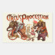 A circus procession winds through the main streest of towns, before the big top is set up that gathers crowds of circus goers. The illustration, The Circus Procession, was the cover of an antique children's book printed in 1888 by McLoughlin Brothers of New York.