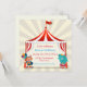 A fun squareba invitation with a circus theme features a red and white circus tent, a clown with balloons and a blue elephant.