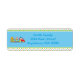 This Circus themed personalised return address label features a light blue background bordered by a repeating pattern of yellow, red, blue, and green stars. A circus train carrying a cute monkey, lion and funny clown sits the left of the template area where you can add your address or other custom text.