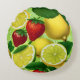 A vibrant round pillow featuring bright lemons, limes, and strawberries in a fresh botanical style on a soft green background. The cheerful, summery palette adds a lively accent to living rooms, bedrooms, and cosy reading spaces. A stylish choice for women who love fruity motifs, colourful décor, and gift‑ready home accessories.