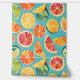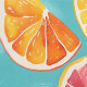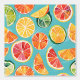 This artwork showcases a lively and refreshing pattern of citrus fruits, featuring vibrant slices of oranges, lemons, limes, and grapefruits against a bright turquoise background. The juicy, colourful fruit slices are depicted with a playful and stylised approach, capturing the essence of summertime and freshness. The use of bold, contrasting colours and the circular arrangement of the fruits create a dynamic and eye-catching composition that exudes energy and zest.