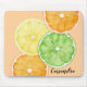 Cute mouse pad has citrus fruit on it, including lemon, lime and oranges, against a pale orange background. Personalise with your name at the bottom in black script.