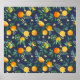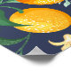 Tropical vibes with oranges, leaves, and flowers on blue.