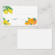 Lemon and orange watercolor citrus wedding place cards with table number. Unique watercolor painting of oranges and orange segments with green foliage and yellow lemons on a branch with greenery and lemon segments. original artwork by artist Catherine Sweetman