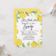 This lemon wreath bridal shower invitation features a brush calligraphy heading in black and a lemon fruit and floral wreath. The back of the invitation is a yellow watercolor wash image with a small dot pattern. This is a sweet design and a lovely way to invite guests to a bridal shower.
