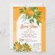 Citrus oranges summer bridal shower invitation template. Citrus themed bridal shower. Orange bunches with oranges, modern white arch border, orange blooms and green leaves.