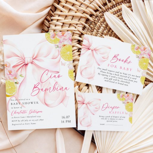 Celebrate the joyous arrival of a little girl with our "Ciao Bambina" baby shower invitation. This charming card features soft, pastel pink delicate watercolor flowers and lemon slices, and a beautifully illustrated bow.
