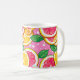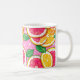 This classic mug features a vibrant citrus design with glossy slices of grapefruit, lemon, and orange arranged against a playful pink background with white polka dots. Fresh green leaves add a lively contrast, creating a cheerful, sunny composition that instantly brightens any kitchen or workspace. Perfect for morning coffee, tea, or cozy evening drinks, this mug blends everyday practicality with a fun, uplifting aesthetic. Its bold, fruity artwork brings a burst of color and joy to every sip.