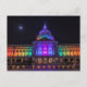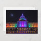 A nighttime photograph captures San Francisco City Hall bathed in vibrant rainbow colours, symbolising inclusivity and pride. The iconic dome, a prominent architectural feature, is illuminated in a soft purple hue. The building's facade is adorned with a spectrum of colours, creating a striking visual display. The scene is set against a dark sky with a faint moon visible in the upper left corner.