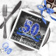 This classy cocktail napkin design features a giant, blue faux-glitter '50', script text 'Fabulous' and ribbon banner over a black and white photograph of a bright city skyline reflected on water. Search ID191 to see additional products with this design.