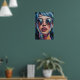 The woman has piercing blue hair and is wearing stylish, round sunglasses. The most captivating feature is the reflection of a colourful, stylised cityscape within the lenses of her glasses, which gives the painting its urban and modern feel.
