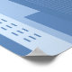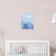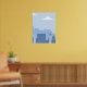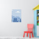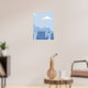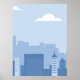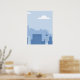 A minimalist graphic cityscape wall art in blue tones with white clouds and skyscrapers. This vertical poster will be perfect for home or office decoration.