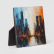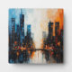 A vibrant, abstract expressionist painting of a modern cityscape at night. The image is split, contrasting cool blues and whites on the left with warm oranges and fiery reds on the right. Tall, dark skyscrapers are reflected in the water below, highlighted by the bright, electric windows and the dramatic colour shift above. The impasto technique gives the painting a dynamic, textured feel.