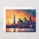A San Francisco postcard of a sunset cityscape with the golden gate bridge in the distance. This art postcard is part of a series of postcards created in a post impressionism art style and is inspired by different locations around the world.