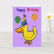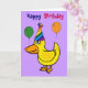 Funny cartoon duck wearing a birthday hat with balloons birthday card says Happy Birthday and inside says: Hope your birthday is just Ducky!