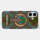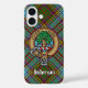 Clan Anderson crest badge surrounded by a strap and buckle over tartan background. Custom text.
