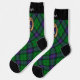 Clan Armstrong crest badge surrounded by a strap and buckle over tartan background. Custom top stripe colour. Custom text on each sock.