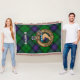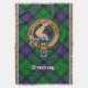 Clan Armstrong crest badge surrounded by a strap and buckle over tartan background. Custom text.