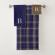 Monogrammed bath towel set done in a traditional blue and brown Scottish clan Baker tartan plaid pattern. The hand towel is done in a solid blue, with a large white monogram and the wash cloth is done in light brown, with a white monogram. Personalise the monogram to suit your needs.