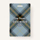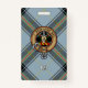 Clan Bell crest badge surrounded by a strap and buckle over tartan background. Custom text.