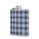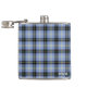 Monogrammed flask in the family tartan of Clan Bell, a traditional plaid pattern in light blue and black, with bright red, green, and yellow accents. Also known as Bell of the Borders. Available in two sizes.