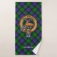 Clan Blair crest badge surrounded by a strap and buckle over tartan background. Custom text on each towel.