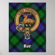Clan Blair crest badge surrounded by a strap and buckle over tartan background. Custom text.
