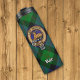 Clan Blair crest badge surrounded by a strap and buckle over tartan background. Custom text.
