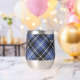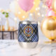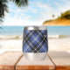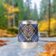 Clan Clark crest badge surrounded by a strap and buckle over tartan background. Custom text on both sides.