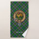 Clan Cockburn crest badge surrounded by a strap and buckle over tartan background. Custom text on each towel.
