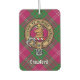 Clan Crawford crest badge surrounded by a strap and buckle over tartan background. Custom text on both sides.