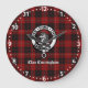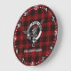 Stylish wall clock features Scottish Clan Cunningham crest badge and customisable text on tartan background with white numerical clock face.