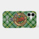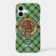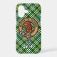 Clan Currie rooster crest badge surrounded by a strap and buckle over tartan background. Custom text.
