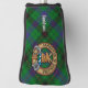 Clan Davidson crest badge surrounded by a strap and buckle over tartan background. Custom text.
