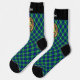 Clan Douglas crest badge surrounded by a strap and buckle over tartan background. Custom top stripe colour. Custom text on each sock.