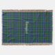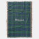Colourful custom fringe end throw blanket made with graphics of the blue, green, and white clan Douglas tartan plaid pattern. Cream coloured old world style text can be personalised to read what you want. Lovely gift idea for anyone.