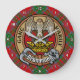 Clan Drummond crest badge surrounded by a strap and buckle over tartan background. Custom text.