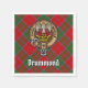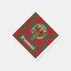 Clan Drummond crest badge surrounded by a strap and buckle over tartan background. Custom text.