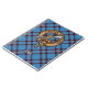 Clan Elliot crest badge surrounded by a strap and buckle over ancient tartan background. Custom text.